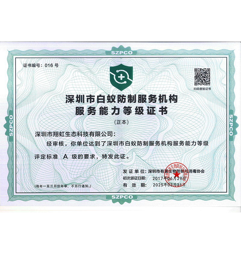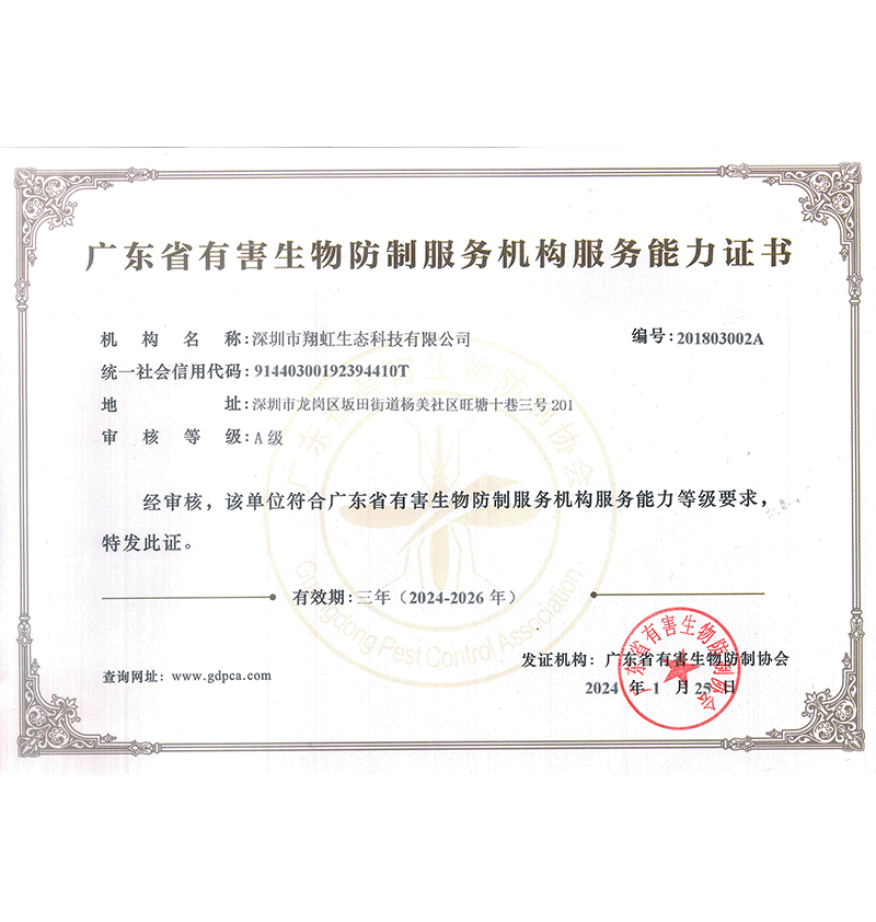 深圳市翔虹生態科技有限公司成立于1995年,是深圳最早成立的專業蟲害防治公司之一。公司發展至今獲得全國有害生物防制服務A級資質、廣東省有害生物防制服務A級資質、深圳市有害生物防制服務A級資質、廣東省有害生物防制服務A級資質、深圳市有害生物防制服務甲級資質的單位,是中國有害生物防治協會會員、廣東省有害生物防治協會會員、深圳市有害生物防治協會理事單位,多次獲得“深圳市十佳消殺單位”榮譽。